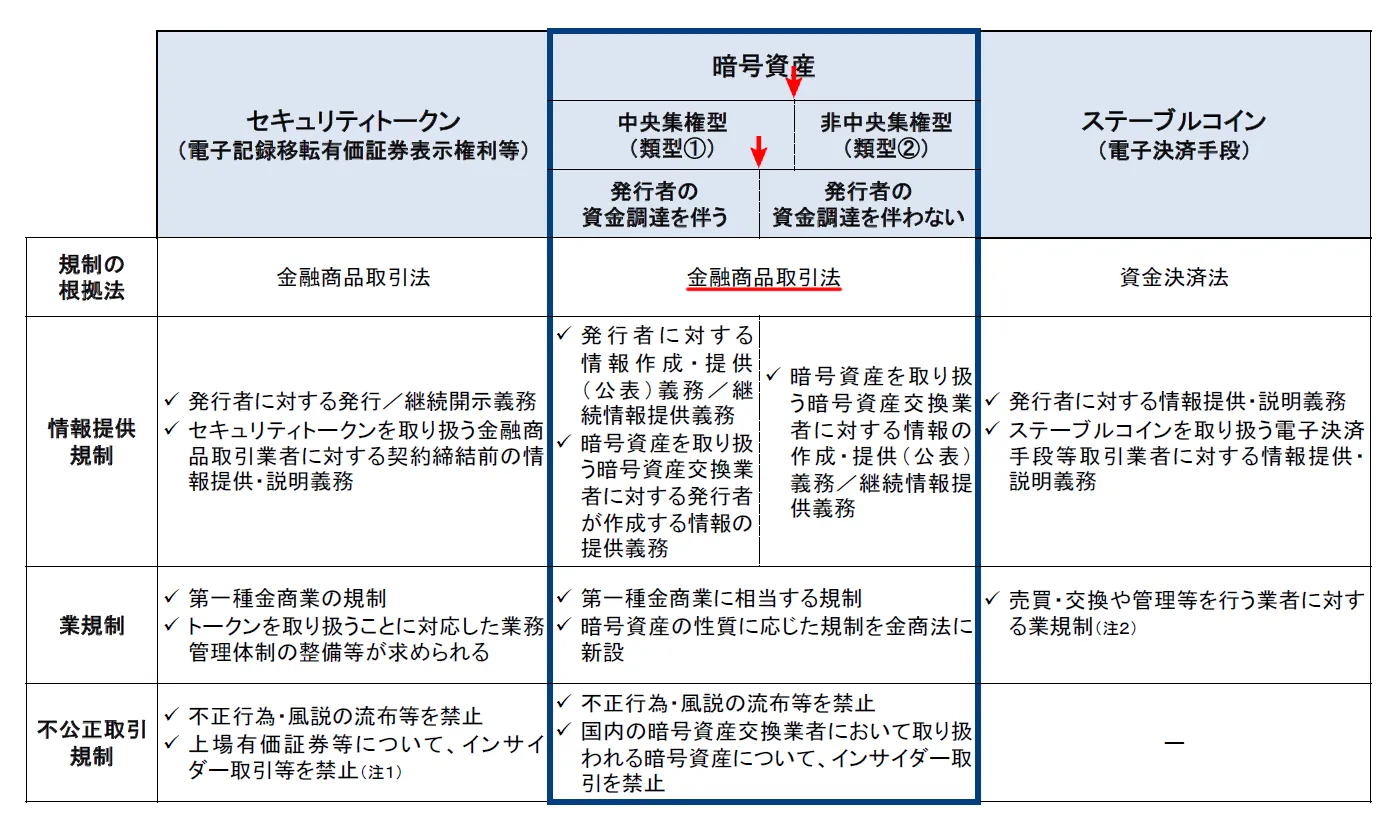 さらに、暗号資産は「中央集権型(類型①)」と「非中央集権型(類型②)」に分類され、どちらも金商法で規律されることになります。