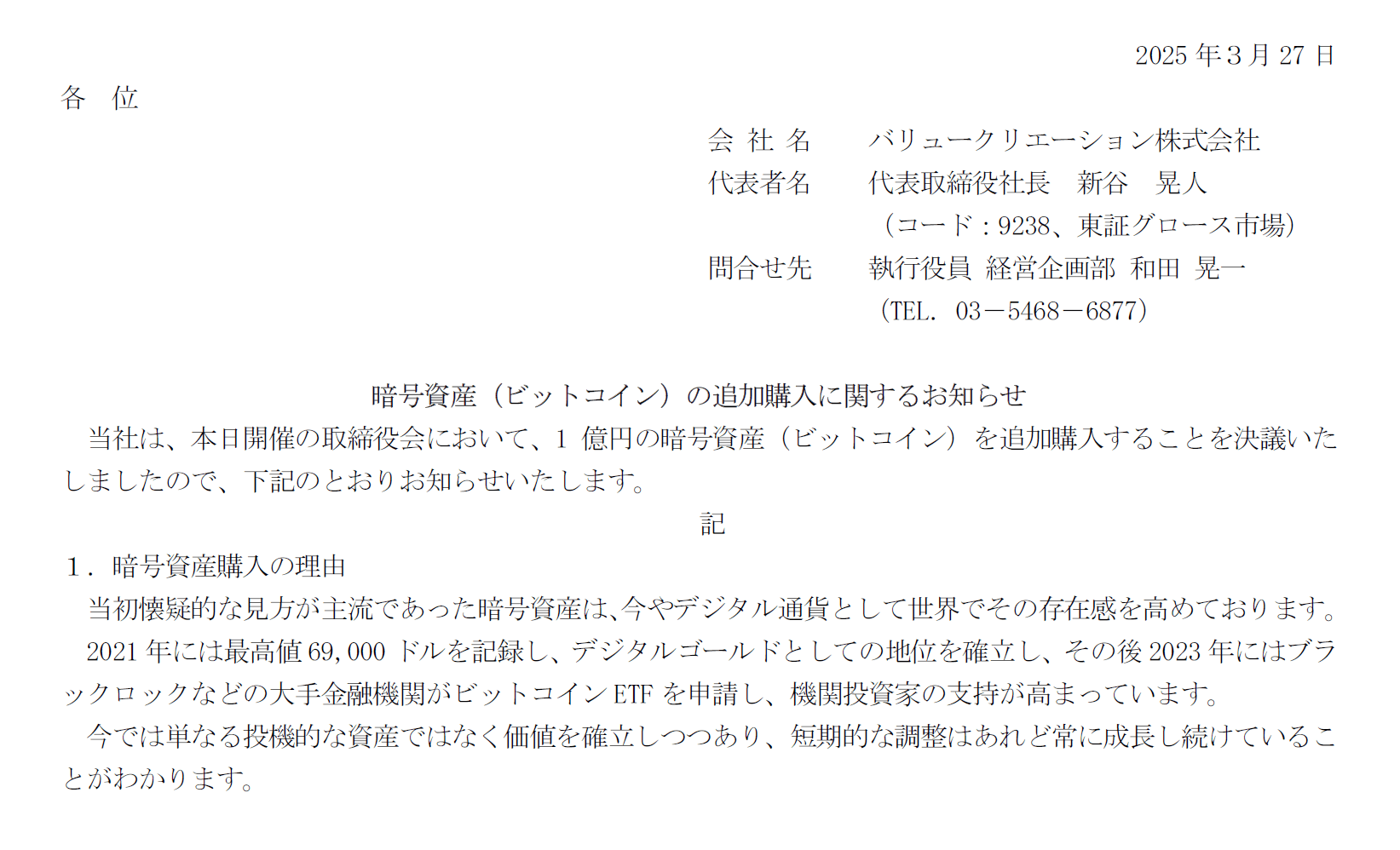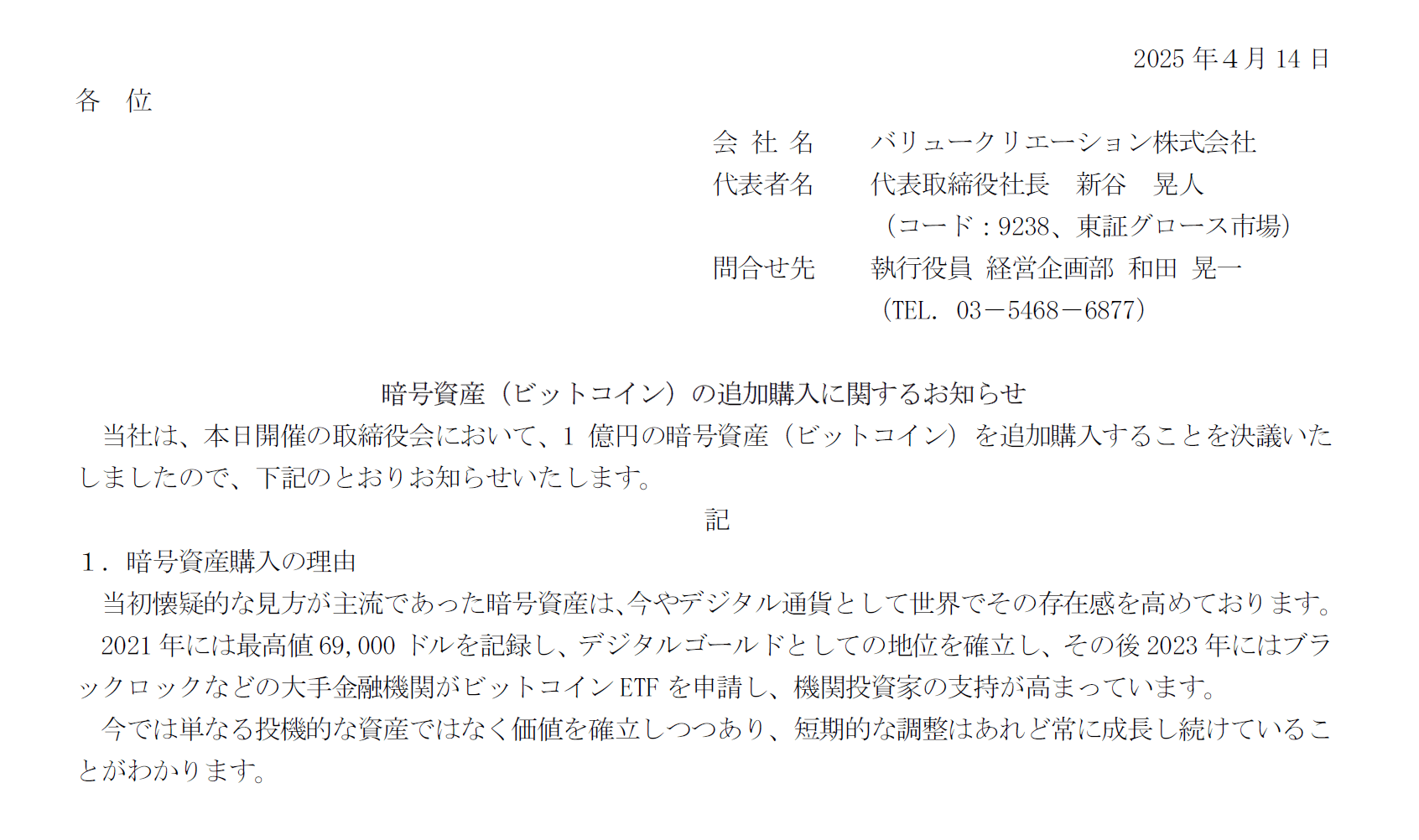 このページでは、バリュークリエーション株式会社のビットコインの購入と、暗号資産事業に関する情報を追記してきます。