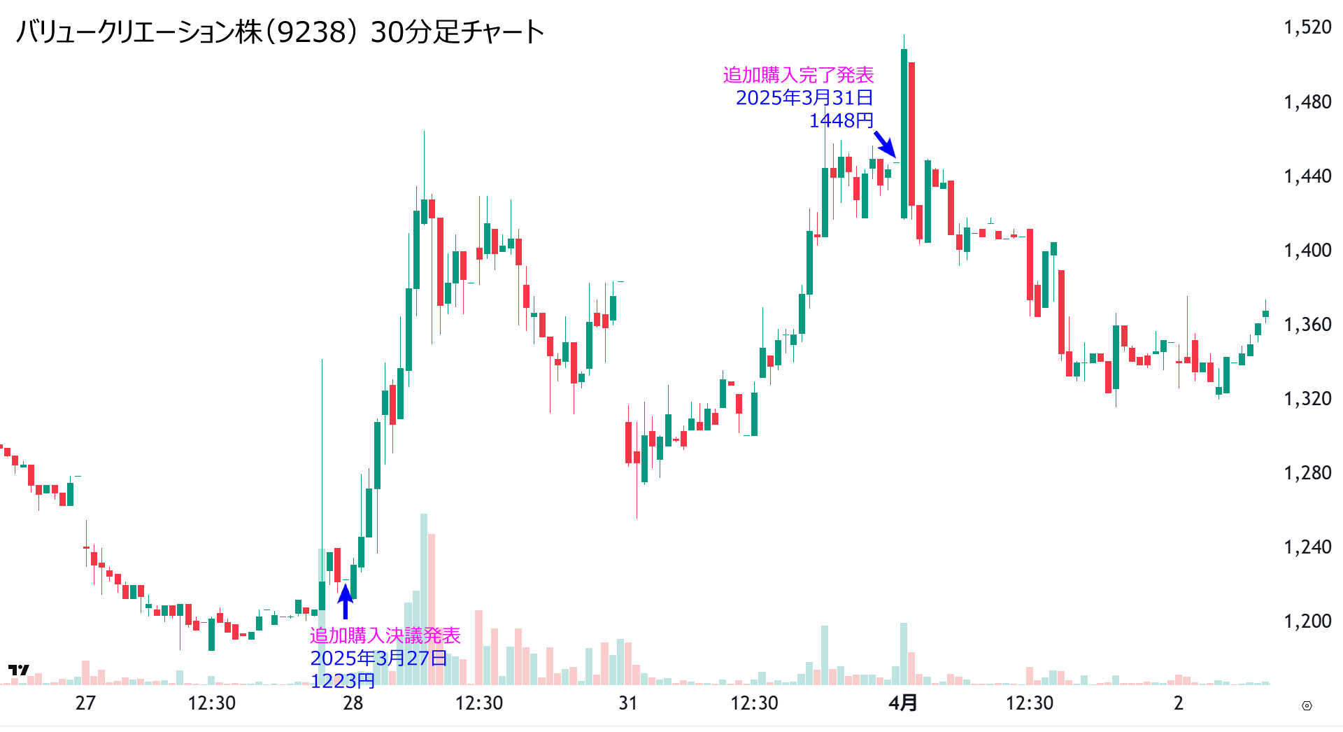 3月27日15時に1億円分のビットコイン追加購入決議を発表し、3月31日15時に購入完了を発表しました。