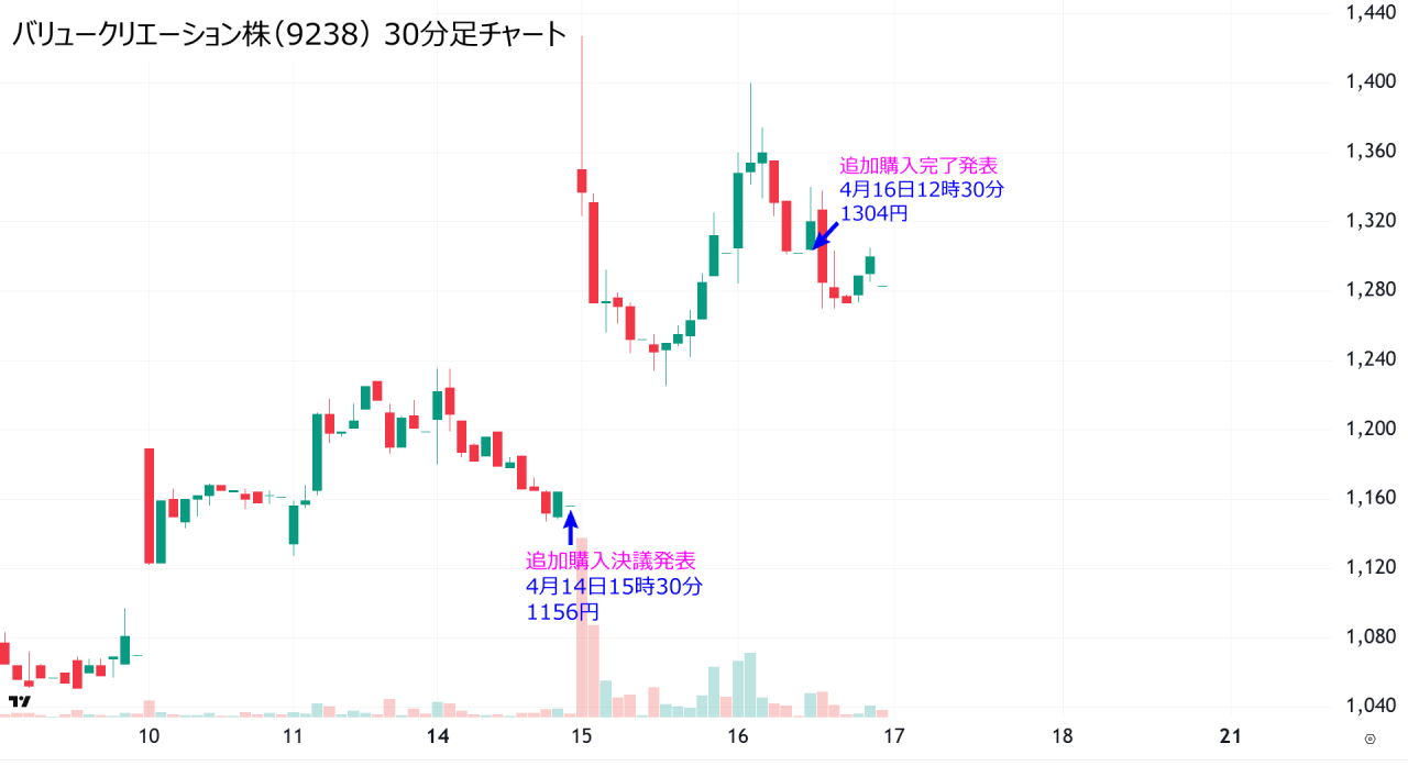 この発表を受けて、バリュ―クリエイションの株価はストップ高まで急騰し、6ヶ月ぶりの価格をつけました。